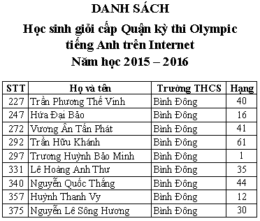 Danh sách học sinh giỏi Tiếng Anh cấp Quận kỳ thi Olympic Tiếng Anh Trên Internet năm học 2015-2016.